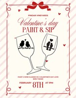Have fun painting 2 wine glasses in a Valentine's Day - Love Bird - theme! Join Maggie with Wine of a Kind for this special Glass Painting Workshop. The cost is $40 per person. Guests hand paint two glasses. All materials provided. Check-in time is 12:45 p.m. Class will start at 1 p.m. Reservations are required and space is limited.